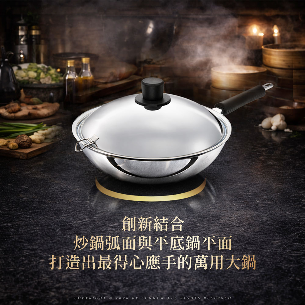 平底圓弧式鍋身設計,結合中式炒鍋與平底鍋優點,可用於電磁爐、IH爐,不挑爐具。