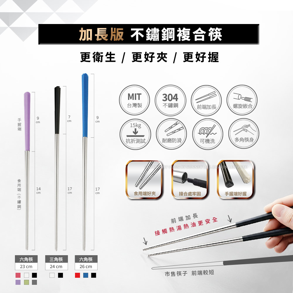 加長版不鏽鋼複合筷六角23cm (黑/白/綠/紫/灰)